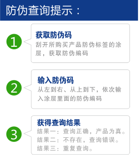 注: 刮开涂层, 从左到右, 从上到下依次输入防伪编码(中间无空格), 然后点击"查询", 即可辨别真伪